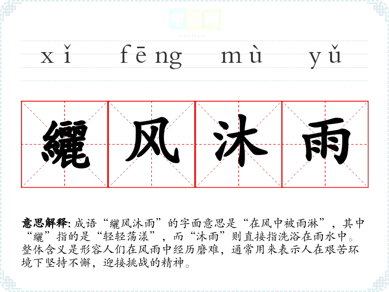 成语“纚风沐雨”的字面意思是“在风中被雨淋”,其中“纚”指的是“轻轻荡漾”,而“沐雨”则直接指洗浴在雨水中。整体含义是形容人们在风雨中经历磨难,通常用来表示人在艰苦环境下坚持不懈,迎接挑战的精神。
