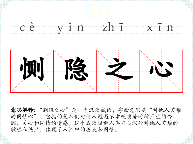 | 恻隐之心 | 恻隐:对别人的不幸表示同情。形容对人寄予同情。 |