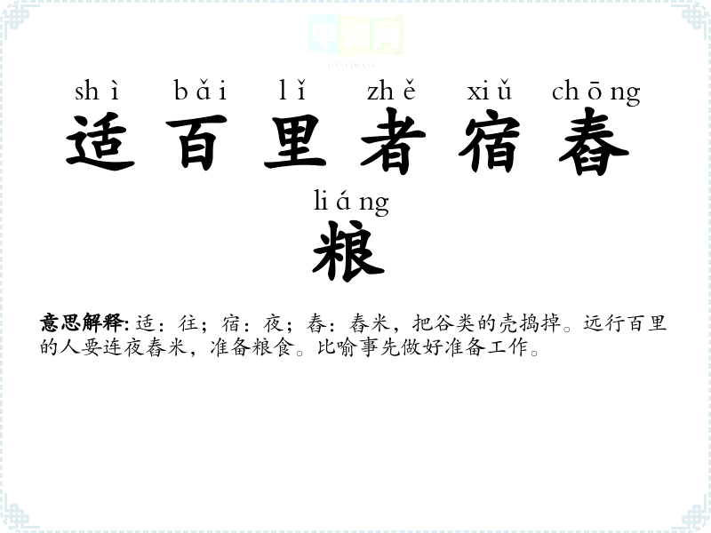 | 适百里者宿舂粮 | 适:往;宿:夜;舂:舂米,把谷类的壳捣掉。远行百里的人要连夜舂米,准备粮食。比喻事先做好准备工作。 |
