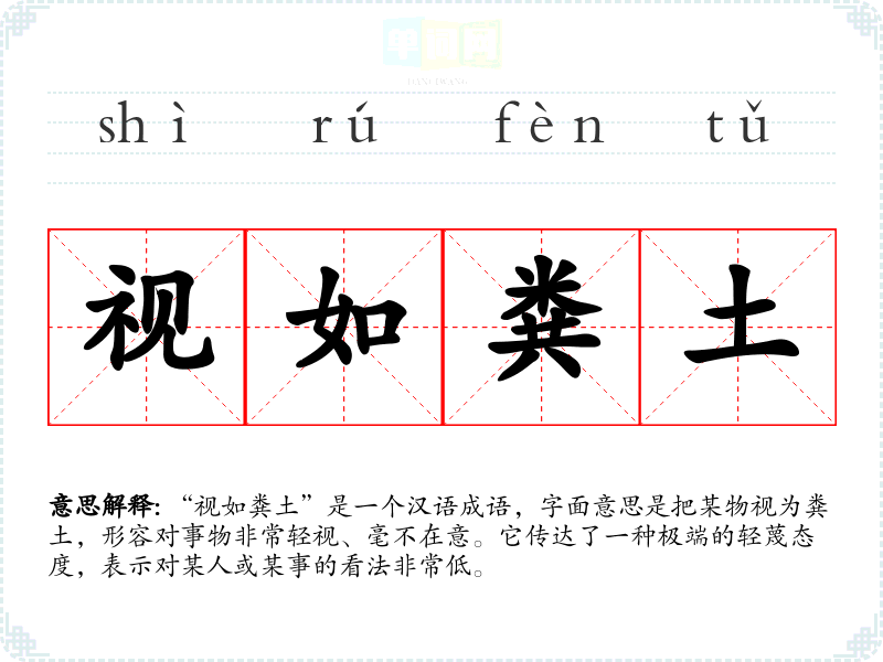 “视如粪土”是一个汉语成语,字面意思是把某物视为粪土,形容对事物非常轻视、毫不在意。它传达了一种极端的轻蔑态度,表示对某人或某事的看法非常低。