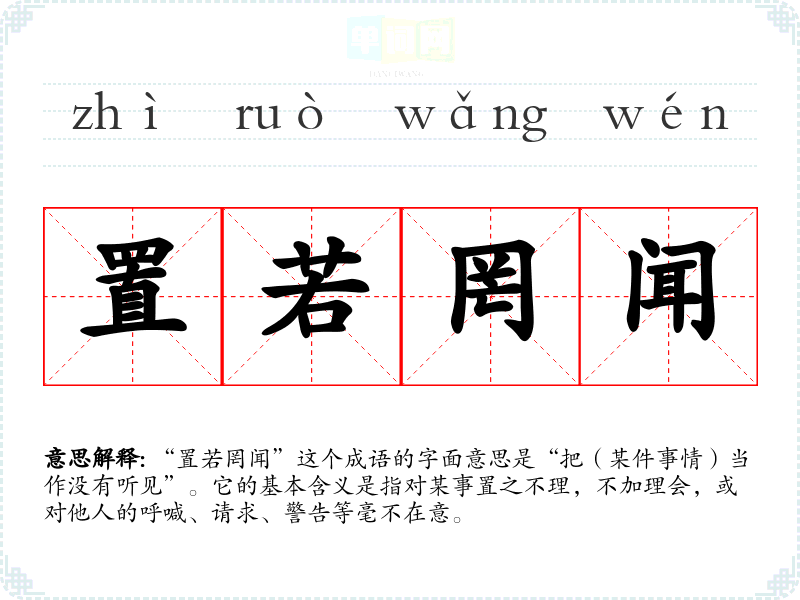 “置若罔闻”这个成语的字面意思是“把(某件事情)当作没有听见”。它的基本含义是指对某事置之不理,不加理会,或对他人的呼喊、请求、警告等毫不在意。