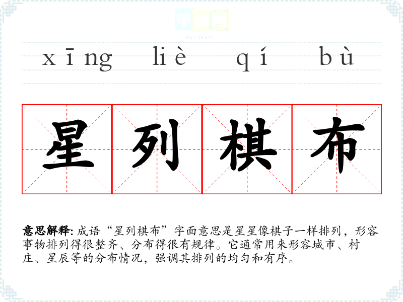 成语“星列棋布”字面意思是星星像棋子一样排列,形容事物排列得很整齐、分布得很有规律。它通常用来形容城市、村庄、星辰等的分布情况,强调其排列的均匀和有序。