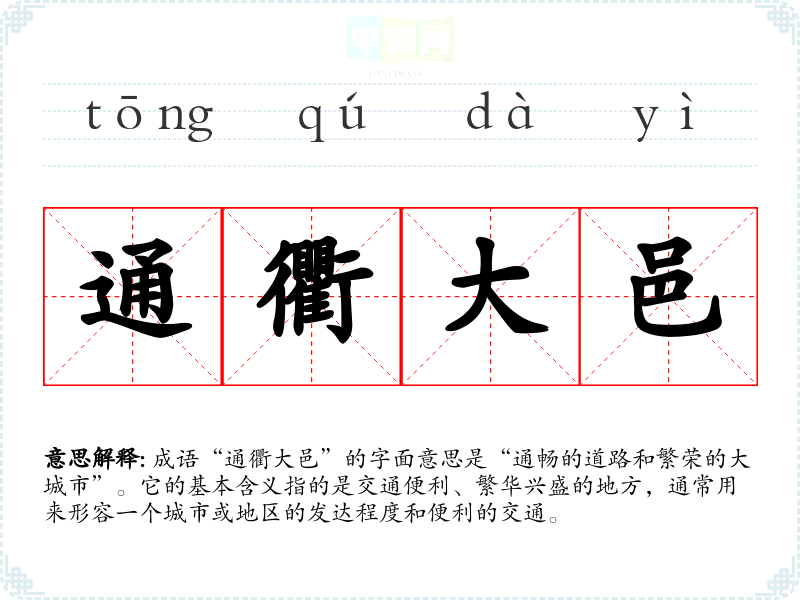 成语“通衢大邑”的字面意思是“通畅的道路和繁荣的大城市”。它的基本含义指的是交通便利、繁华兴盛的地方,通常用来形容一个城市或地区的发达程度和便利的交通。