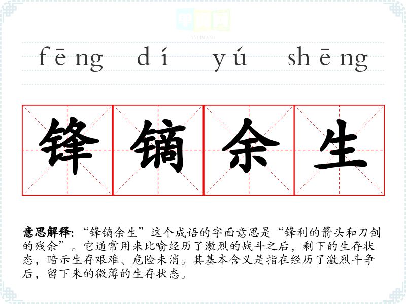 “锋镝余生”这个成语的字面意思是“锋利的箭头和刀剑的残余”。它通常用来比喻经历了激烈的战斗之后,剩下的生存状态,暗示生存艰难、危险未消。其基本含义是指在经历了激烈斗争后,留下来的微*的生存状态。