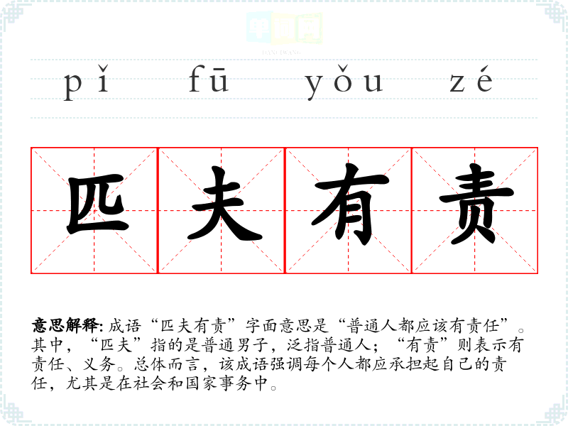 成语“匹夫有责”字面意思是“普通人都应该有责任”。其中,“匹夫”指的是普通男子,泛指普通人;“有责”则表示有责任、义务。总体而言,该成语强调每个人都应承担起自己的责任,尤其是在社会和国家事务中。
