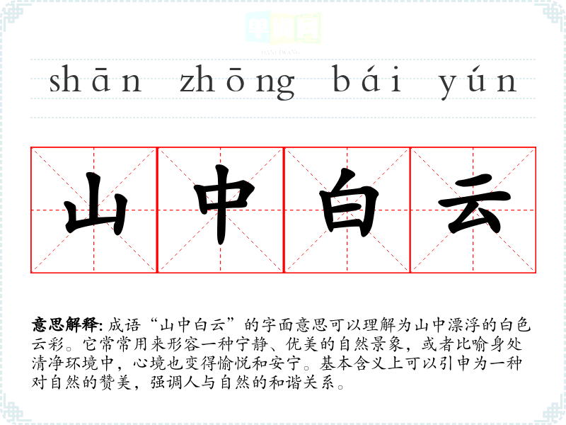 成语“山中白云”的字面意思可以理解为山中漂浮的白色云彩。它常常用来形容一种宁静、优美的自然景象,或者比喻身处清净环境中,心境也变得愉悦和安宁。基本含义上可以引申为一种对自然的赞美,强调人与自然的和谐关系。