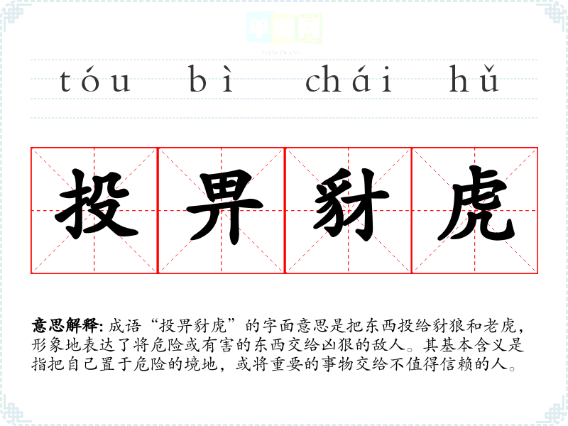 成语“投畀豺虎”的字面意思是把东西投给豺狼和**,形象地表达了将危险或有害的东西交给凶狠的敌人。其基本含义是指把自己置于危险的境地,或将重要的事物交给不值得信赖的人。