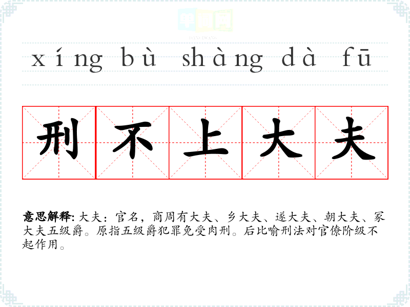 | 刑不上大夫 | 大夫:官名,商周有大夫、乡大夫、遂大夫、朝大夫、冢大夫五级爵。原指五级爵犯罪免受肉刑。后比喻刑法对官僚阶级不起作用。 |