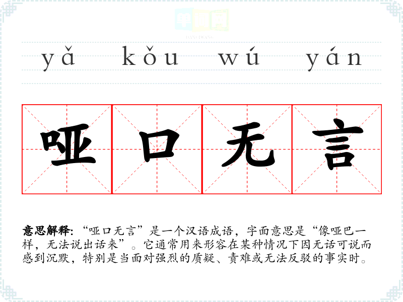 “哑口无言”是一个汉语成语,字面意思是“像哑巴一样,无法说出话来”。它通常用来形容在某种情况下因无话可说而感到沉默,特别是当面对强烈的质疑、责难或无法反驳的事实时。