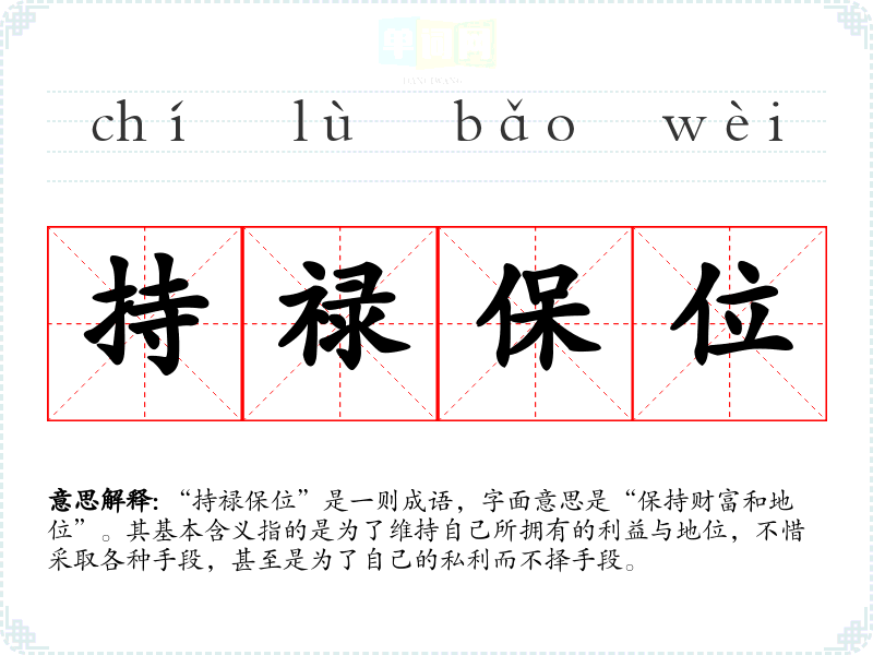 | 持禄保位 | 禄:旧时官吏的薪俸。为了保持俸禄官位,大臣阿谀奉承,不敢直言进谏。也指大臣有过失不肯引咎辞职。 |
