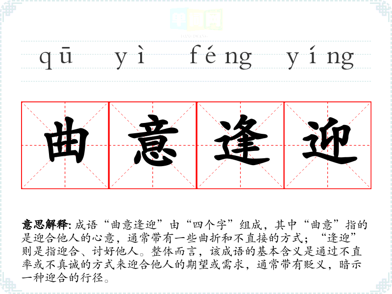 成语“曲意逢迎”由“四个字”组成,其中“曲意”指的是迎合他人的心意,通常带有一些曲折和不直接的方式;“逢迎”则是指迎合、讨好他人。整体而言,该成语的基本含义是通过不直率或不真诚的方式来迎合他人的期望或需求,通常带有贬义,暗示一种迎合的行径。