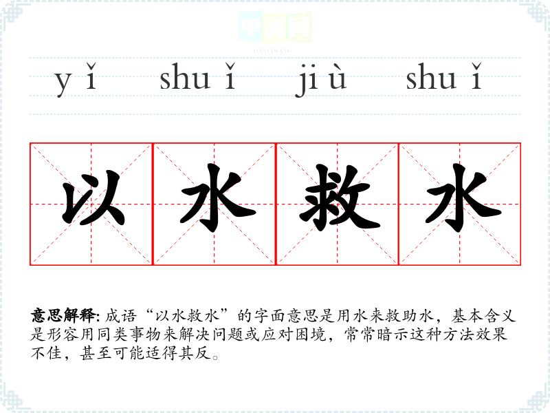 成语“以水救水”的字面意思是用水来救助水,基本含义是形容用同类事物来解决问题或应对困境,常常暗示这种方法效果不佳,甚至可能适得其反。