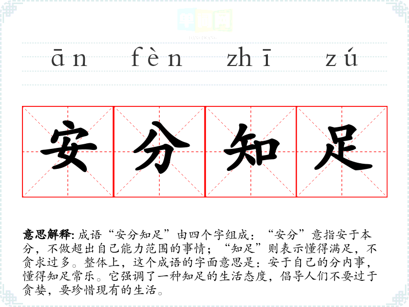 成语“安分知足”由四个字组成:“安分”意指安于本分,不做超出自己能力范围的事情;“知足”则表示懂得满足,不贪求过多。整体上,这个成语的字面意思是:安于自己的分内事,懂得知足常乐。它强调了一种知足的生活态度,倡导人们不要过于贪婪,要珍惜现有的生活。