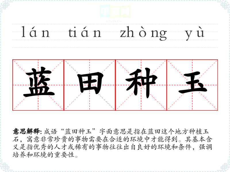 成语“蓝田种玉”字面意思是指在蓝田这个地方种植玉石,寓意非常珍贵的事物需要在合适的环境中才能得到。其基本含义是指优秀的人才或稀有的事物往往出自良好的环境和条件,强调培养和环境的重要性。