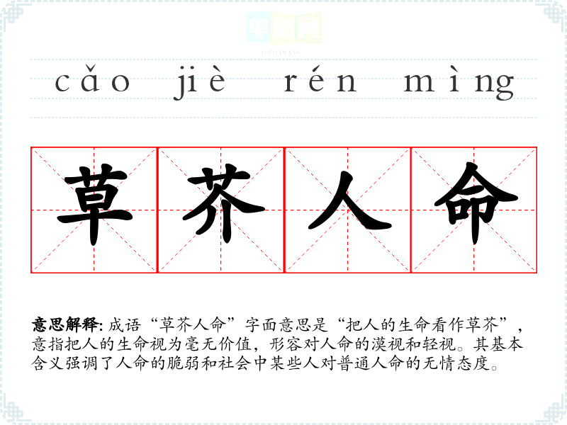 成语“草芥人命”字面意思是“把人的生命看作草芥”,意指把人的生命视为毫无价值,形容对人命的漠视和轻视。其基本含义强调了人命的脆弱和社会中某些人对普通人命的无情态度。