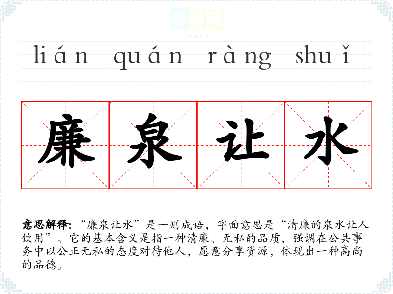 “廉泉让水”是一则成语,字面意思是“清廉的泉水让人饮用”。它的基本含义是指一种清廉、无私的品质,强调在公共事务中以公正无私的态度对待他人,愿意分享资源,体现出一种高尚的品德。