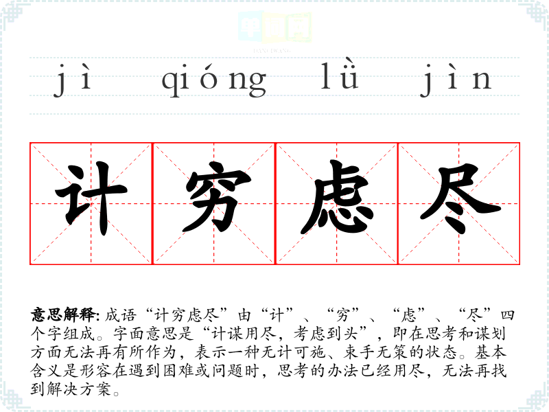 成语“计穷虑尽”由“计”、“穷”、“虑”、“尽”四个字组成。字面意思是“计谋用尽,考虑到头”,即在思考和谋划方面无法再有所作为,表示一种无计可施、束手无策的状态。基本含义是形容在遇到困难或问题时,思考的办法已经用尽,无法再找到解决方案。