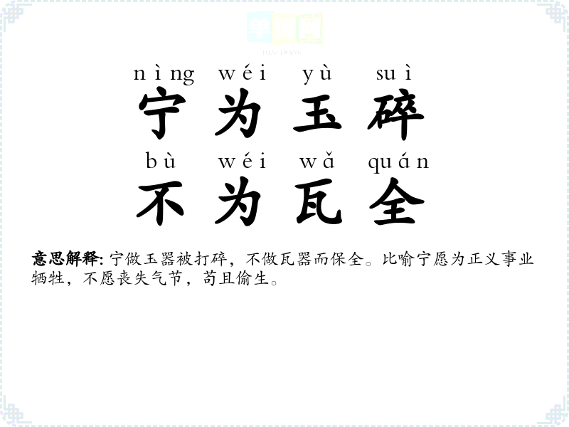 | 宁玉碎,毋瓦全 | 宁:宁愿;毋:不要。宁做玉器被打碎,不做陶器得保全。比喻宁愿为正义而死,决不苟且偷生。 |