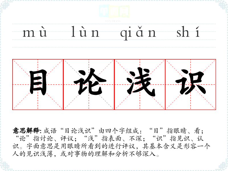 成语“目论浅识”由四个字组成:“目”指眼睛、看;“论”指讨论、评议;“浅”指表面、不深;“识”指见识、认识。字面意思是用眼睛所看到的进行评议,其基本含义是形容一个人的见识浅*,或对事物的理解和分析不够深入。
