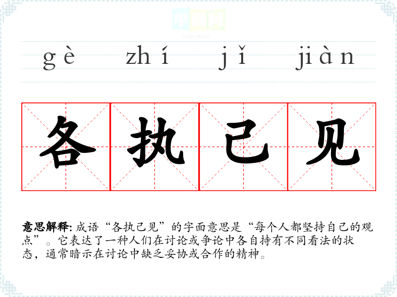 成语“各执己见”的字面意思是“每个人都坚持自己的观点”。它表达了一种人们在讨论或争论中各自持有不同看法的状态,通常暗示在讨论中缺乏妥协或合作的精神。