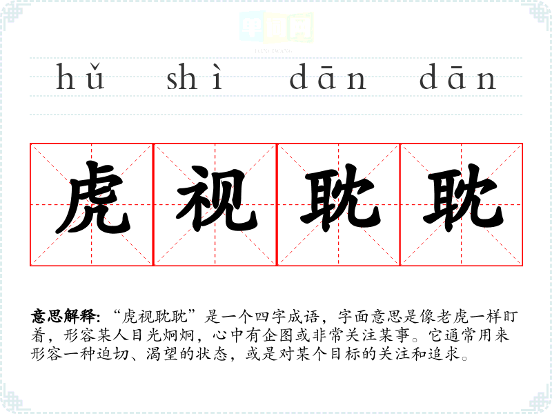 “虎视耽耽”是一个四字成语,字面意思是像**一样盯着,形容某人目光炯炯,心中有企图或非常关注某事。它通常用来形容一种迫切、渴望的状态,或是对某个目标的关注和追求。