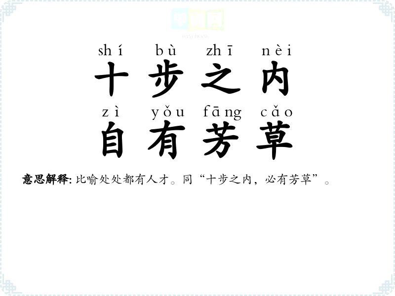 | 十步之内,必有芳草 | 比喻处处都有人才。 |
