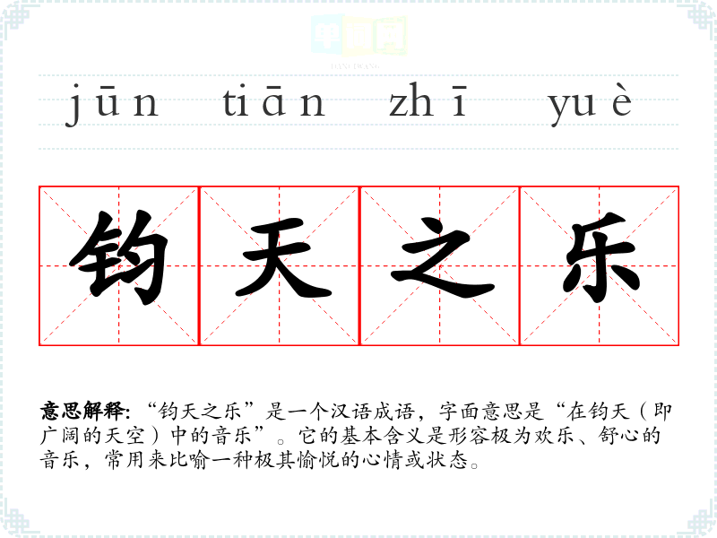 “钧天之乐”是一个汉语成语,字面意思是“在钧天(即广阔的天空)中的音乐”。它的基本含义是形容极为欢乐、舒心的音乐,常用来比喻一种极其愉悦的心情或状态。
