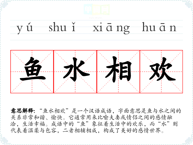 “鱼水相欢”是一个汉语成语,字面意思是鱼与水之间的关系非常和谐、愉快。它通常用来比喻夫妻或情侣之间的感情融洽,生活幸福。成语中的“鱼”象征着生活中的欢乐,而“水”则代表着温柔与包容,二者相辅相成,构成了美好的感情世界。