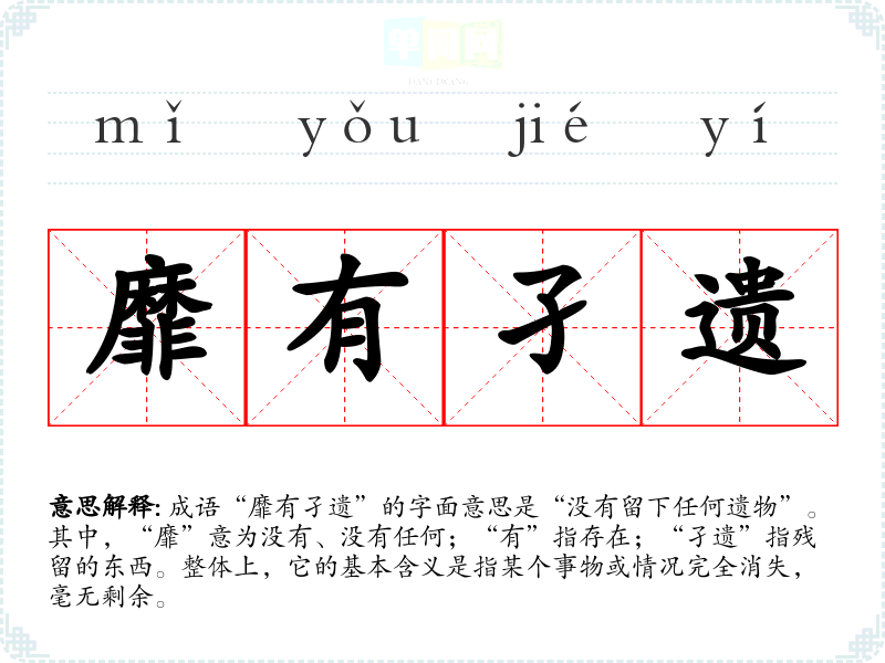 成语“靡有孑遗”的字面意思是“没有留下任何遗物”。其中,“靡”意为没有、没有任何;“有”指存在;“孑遗”指残留的东西。整体上,它的基本含义是指某个事物或情况完全消失,毫无剩余。