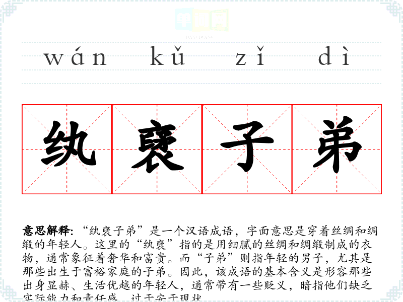 | 纨绔子弟 | 纨裤:细绢裤。衣着华美的年轻人。旧时指官僚、地主等有钱有势人家成天吃喝玩乐、不务正业的子弟。 |