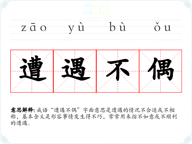 成语“遭遇不偶”字面意思是遭遇的情况不合适或不相称,基本含义是形容事情发生得不巧,常常用来指不如意或不顺利的遭遇。
