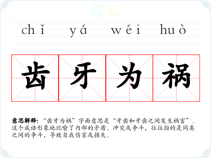 “齿牙为祸”字面意思是“牙齿和牙齿之间发生祸害”。这个成语形象地比喻了内部的矛盾、冲突或争斗,往往指的是同类之间的争斗,导致自我伤害或损失。