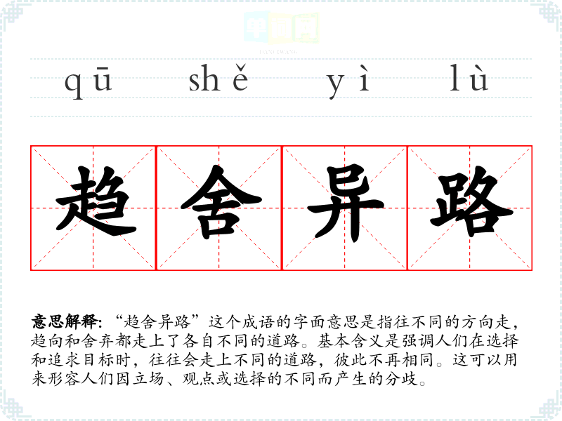 “趋舍异路”这个成语的字面意思是指往不同的方向走,趋向和舍弃都走上了各自不同的道路。基本含义是强调人们在选择和追求目标时,往往会走上不同的道路,彼此不再相同。这可以用来形容人们因立场、观点或选择的不同而产生的分歧。