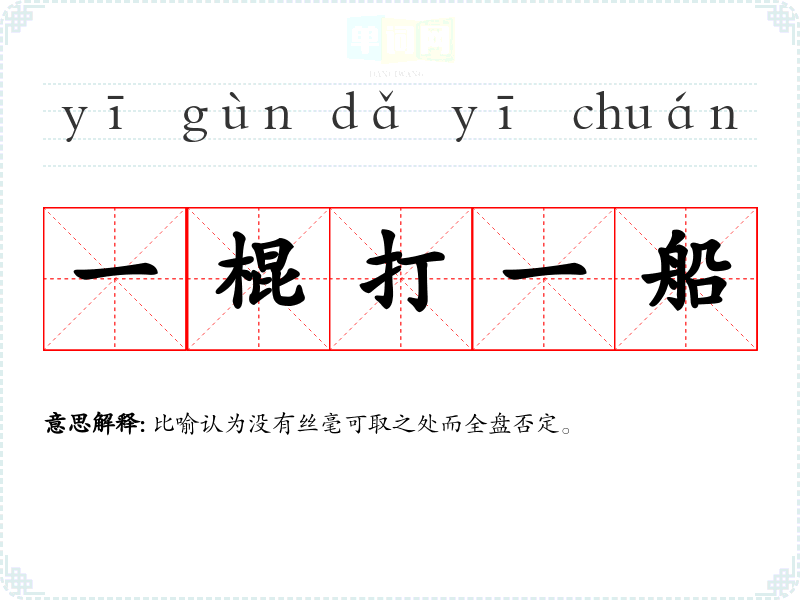 | 一棍打一船 | 比喻认为没有丝毫可取之处而全盘否定。 |
