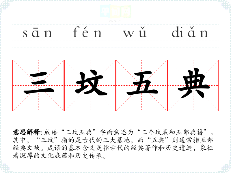 成语“三坟五典”字面意思为“三个坟墓和五部典籍”。其中,“三坟”指的是古代的三大墓地,而“五典”则通常指五部经典文献。成语的基本含义是指古代的经典著作和历史遗迹,象征着深厚的文化底蕴和历史传承。