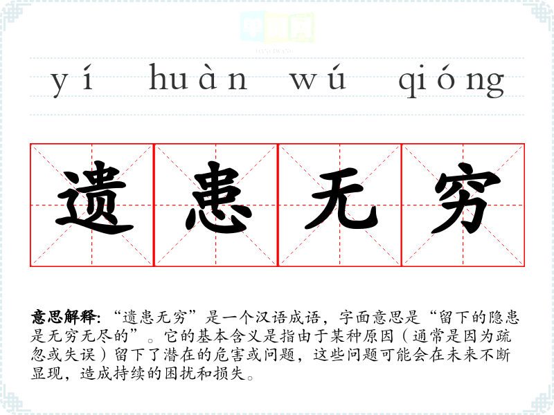“遗患无穷”是一个汉语成语,字面意思是“留下的隐患是无穷无尽的”。它的基本含义是指由于某种原因(通常是因为疏忽或失误)留下了潜在的危害或问题,这些问题可能会在未来不断显现,造成持续的困扰和损失。