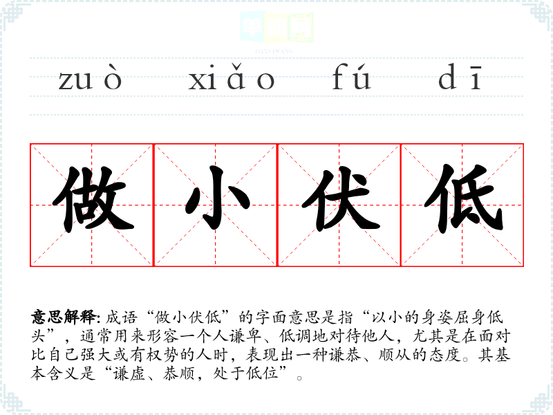 成语“做小伏低”的字面意思是指“以小的身姿屈身低头”,通常用来形容一个人谦卑、低调地对待他人,尤其是在面对比自己强大或有权势的人时,表现出一种谦恭、顺从的态度。其基本含义是“谦虚、恭顺,处于低位”。