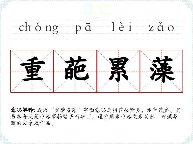 成语“重葩累藻”字面意思是指花朵繁多,水草茂盛。其基本含义是形容事物繁多而华丽,通常用来形容文采斐然、辞藻华丽的文章或作品。