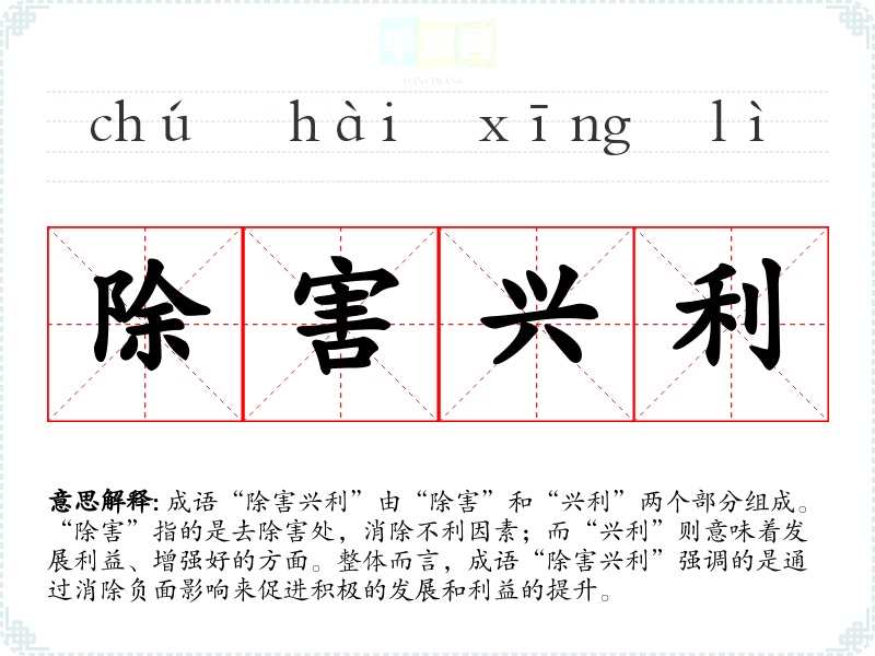 成语“除害兴利”由“除害”和“兴利”两个部分组成。“除害”指的是去除害处,消除不利因素;而“兴利”则意味着发展利益、增强好的方面。整体而言,成语“除害兴利”强调的是通过消除负面影响来促进积极的发展和利益的提升。
