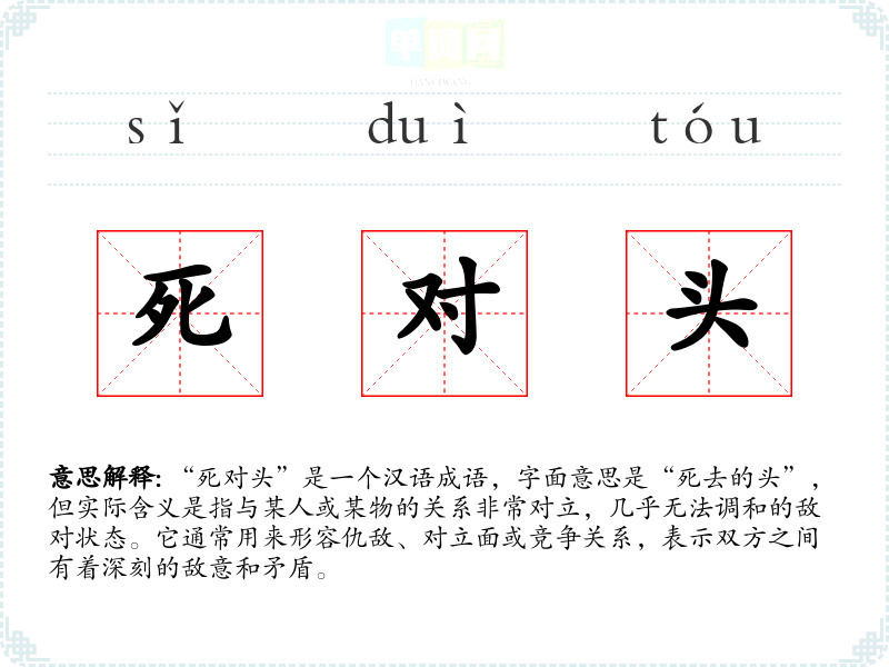 “死对头”是一个汉语成语,字面意思是“死去的头”,但实际含义是指与某人或某物的关系非常对立,几乎无法调和的敌对状态。它通常用来形容仇敌、对立面或竞争关系,表示双方之间有着深刻的敌意和矛盾。