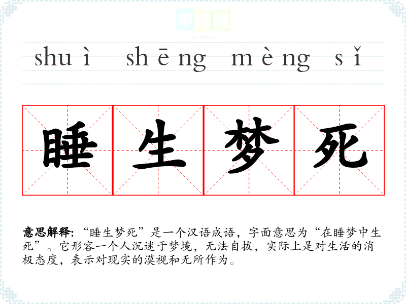 “睡生梦死”是一个汉语成语,字面意思为“在睡梦中生死”。它形容一个人沉迷于梦境,无法自拔,实际上是对生活的消极态度,表示对现实的漠视和无所作为。
