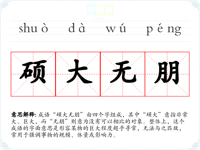 硕大无朋 硕:大;朋:比。大得没有可以与之相比的。形容极大。