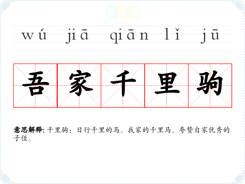 | 吾家千里驹 | 千里驹:日行千里的马。我家的千里马。夸赞自家优秀的子侄。 |