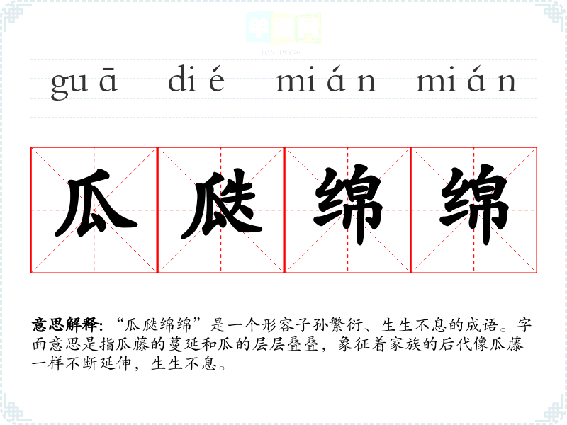 “瓜瓞绵绵”是一个形容子孙繁衍、生生不息的成语。字面意思是指瓜藤的蔓延和瓜的层层叠叠,象征着家族的后代像瓜藤一样不断延伸,生生不息。