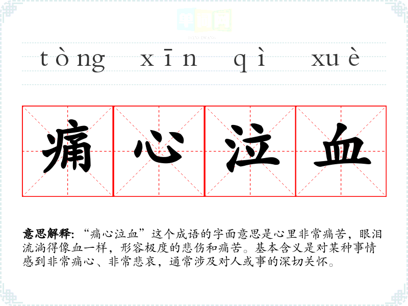 “痛心泣血”这个成语的字面意思是心里非常痛苦,眼泪流淌得像血一样,形容极度的悲伤和痛苦。基本含义是对某种事情感到非常痛心、非常悲哀,通常涉及对人或事的深切关怀。