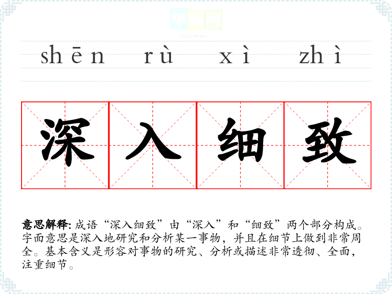 成语“深入细致”由“深入”和“细致”两个部分构成。字面意思是深入地研究和分析某一事物,并且在细节上做到非常周全。基本含义是形容对事物的研究、分析或描述非常透彻、全面,注重细节。