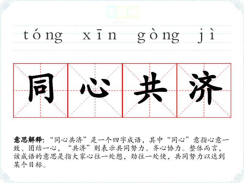 “同心共济”是一个四字成语,其中“同心”意指心意一致、团结一心,“共济”则表示共同努力、齐心协力。整体而言,该成语的意思是指大家心往一处想,劲往一处使,共同努力以达到某个目标。