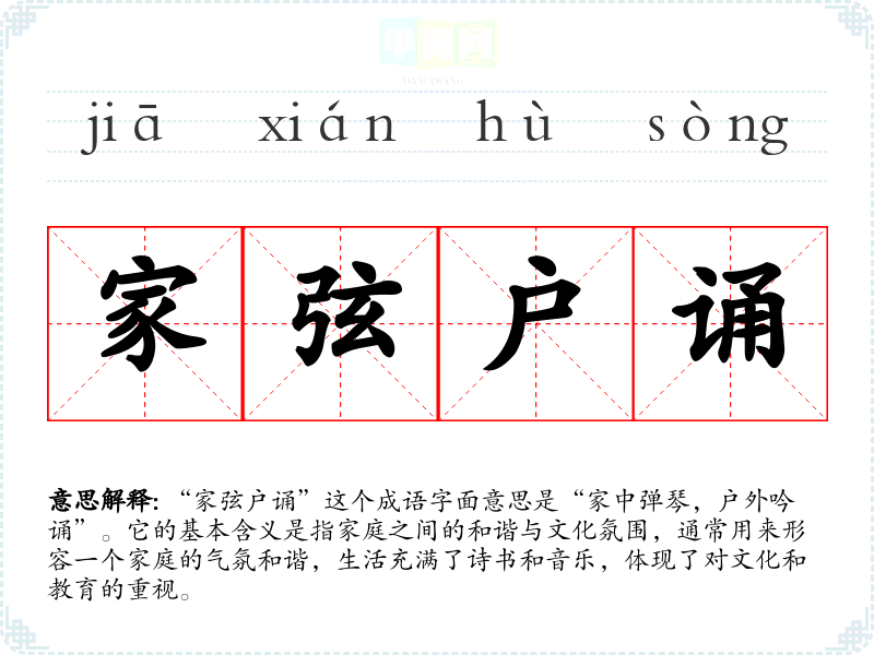 “家弦户诵”这个成语字面意思是“家中弹琴,户外吟诵”。它的基本含义是指家庭之间的和谐与文化氛围,通常用来形容一个家庭的气氛和谐,生活充满了诗书和音乐,体现了对文化和教育的重视。