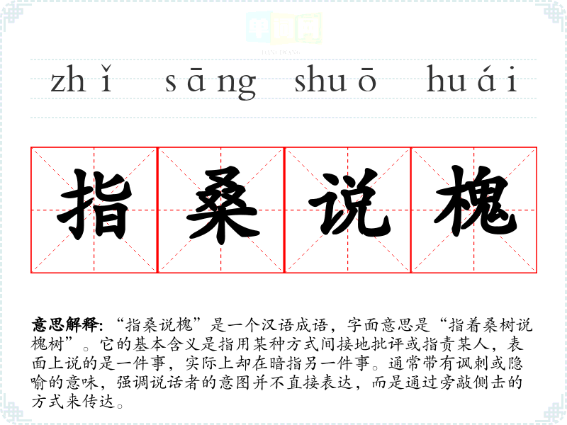 “指桑说槐”是一个汉语成语,字面意思是“指着桑树说槐树”。它的基本含义是指用某种方式间接地批评或指责某人,表面上说的是一件事,实际上却在暗指另一件事。通常带有讽刺或隐喻的意味,强调说话者的意图并不直接表达,而是通过旁敲侧击的方式来传达。