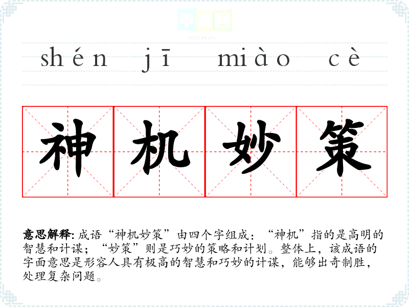 成语“神机妙策”由四个字组成:“神机”指的是高明的智慧和计谋;“妙策”则是巧妙的策略和计划。整体上,该成语的字面意思是形容人具有极高的智慧和巧妙的计谋,能够出奇制胜,处理复杂问题。